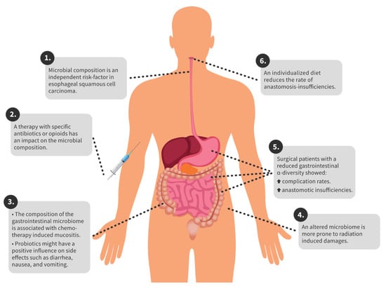 In gastric cancer, different tumour entities have different compositions of the gastric microbiome [48]. In colorectal carcinoma, there are microbiome changes compared to healthy individuals. In particular, Proteobacteria and Actinobacteria occur more frequently in patients with colorectal carcinoma [20]. In the following sections, we give an overview of the complications and corresponding microbiome for specific therapeutic options. Furthermore, in Figure 1 the key findings are summarized for a better overview.