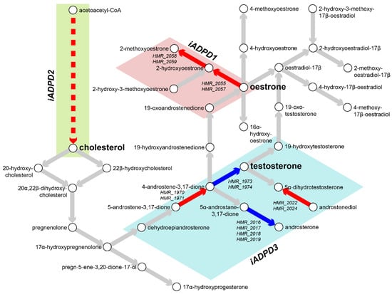 In particular, we observed increased positive fluxes through reactions HMR_2055 and HMR_2059 in iADPD1, which convert oestrone to 2-hydroxyoestrone and then to 2-methoxyoestrone (Figure 3). In iADPDControl, these reactions carried zero flux. In iADPD2, we observed increased positive fluxes through HMR_1457 and HMR_1533, which produce geranyl pyrophosphate and lathosterol, respectively. Both of these molecules are precursors to cholesterol, and while we did not see a proportionate increase in the production of other molecules along the pathway (namely, farnesyl pyrophosphate and squalene), we did observe a general increase in fluxes through the androgen biosynthesis and metabolism pathway. Finally, we observed that iADPD3 displayed a decreased production of testosterone from 4-androstene-3,17-dione via HMR_1974, despite an increase in production of 4-androstene-3,17-dione via HMR_1971.