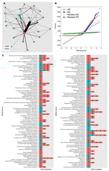Network analysis of AD and PD gene co-expression modules. (A) Gene co-expression networks were constructed from transcriptomic data from AD and PD samples. Community analysis was used to identify gene modules (see the Materials and Methods section). Modules with at least 30 genes are shown as nodes. Node size indicates number of genes. Nodes are coloured by network of origin and numbered in descending order of module size. Shared genes between modules are shown as edges. Edge weight indicates number of shared genes. (B) Degree distribution of AD, PD, and random networks. (C) Enrichment analysis was performed on gene modules containing at least 30 genes using the KEGG database (see the Materials and Methods section). Significantly enriched gene modules are shown as coloured, numbered blocks. Colour and number keys are as in (A).
