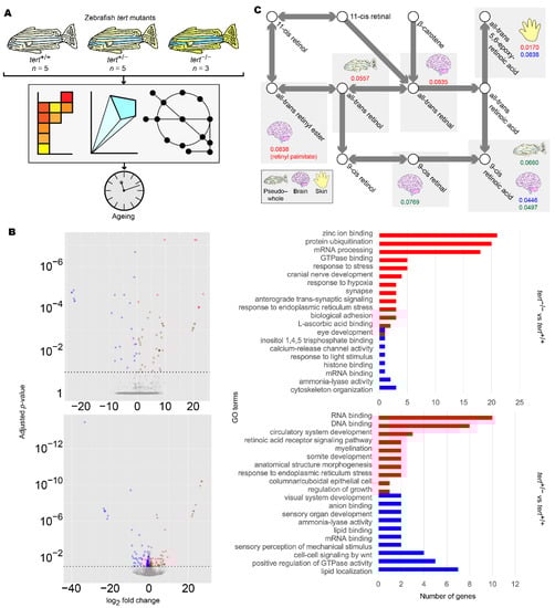 GSE analysis highlighted significant changes related to retinoid function or visual system function, in which retinol and retinal act as signalling molecules [], in all clusters (Figure 2, Supplementary Data S1). Together with the identification of multiple retinol derivatives as significant reporter metabolites in iBrain2845 (Table 3, Supplementary Data S3), we hypothesised that retinoids are a commonly dysregulated class of molecules in both AD and PD, and that this may be due to an ageing mechanism. Indeed, in our investigation with zebrafish telomerase mutants, we again found alterations in retinoid and visual system function in GSE analysis (Figure 5B and Figure S3, Supplementary Data S5) and reporter metabolite analysis (Figure 5C, Table 5, Supplementary Data S6).
