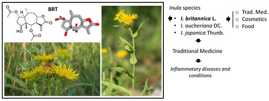 The plant genus Inula (Asteraceae) comprises more than 100 species distributed worldwide (www.theplantlist.org, accessed on 25 September 2021). BRT was first isolated from I. britannica L. in 1968 [9,12,13], but later the product was found in other Inula species [14], such as I. aucheriana DC. [15] and I. japonica Thunb. [16,17]. I. britannica is an erect herb about 50–75 cm tall, with lance-shaped leaves. Each plant produces many yellow ray flowers, positioned on a long flower stalk (Figure 2). The plant is native to regions of Europe and Asia. It was introduced in North America at the beginning of the XXth century. BRT is one of the major natural products isolated from the medicinal plant I. japonica. This plant, designated British yellowhead (or meadow fleabane), is known as Xuanfuhua in traditional Chinese medicine (TCM) to treat sputum, and occasionally as a remedy for nausea, vomiting, hiccups, and flatulence [18,19]. A few years ago, an ethanolic extract of I. japonica was advanced to clinical trials in South Korea for the treatment of chronic bronchitis and asthma [20]. The anti-asthmatic activity of Inulae flos extracts is linked to the presence of BRT in the extract [21]. In Japan, I. britannica is used in Kampo medicine to treat nausea, hiccups, and excessive sputum [22]. In Iranian folk medicine, the plant is utilized in the treatment of arthritis and back pain [23].