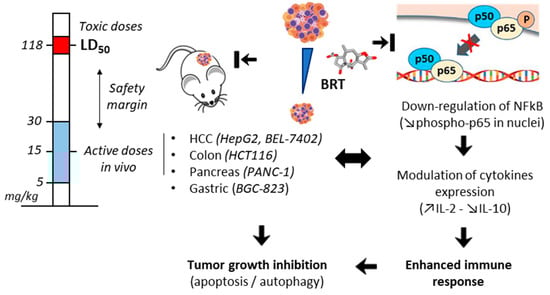 Anticancer activity of BRT in xenograft mice models of solid tumors. The compound was found to reduce tumor growth when administered (intraperitoneally) at the dose of 5–30 mg/kg (active doses), well inferior to the toxic dose (LD50) determined in an acute toxicity study (derived from [65]). The contribution of NFκB inhibition and immune regulation to the anticancer action of action of BRT is highlighted. Inhibition of p65 nuclear expression and up-regulation of interleukin-2 (IL-2) coupled to down-regulation of IL-10 expression have been evidenced in BGC-823 gastric tumors [66]. BRT-induced immune response plays a marked role in the antitumor action.