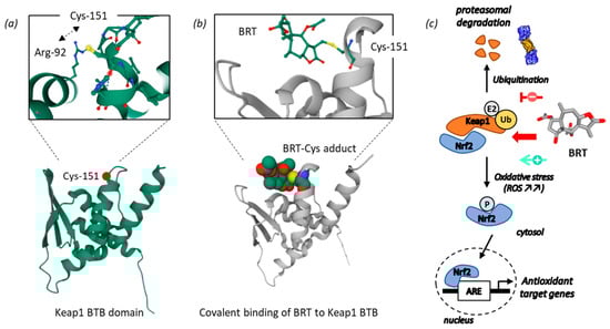 The mode of action of BRT is multifactorial. One of the prime pathways regulated by BRT is the Keap1-Nrf2 pathway which is the main protective response to oxidative and electrophilic stresses. BRT is a potent inducer of the transcription factor Nrf2 (nuclear factor erythroid 2-related factor 2) and does so via a direct binding to a conserved cysteine residue (Cys-151) of Keap1 (Kelch-like ECH-associated protein-1) (Figure 5). Keap1 is a homodimeric protein which orchestrates a complex transcriptional program in responses to a variety of oxidative stress conditions [84]. Under normal conditions, Keap1 traps Nrf2 in the cytoplasm and promotes its degradation by the 26S proteasome. Because of Keap1 binding, BRT inhibits Keap1-mediated ubiquitination of Nrf2 and triggers activation of Nrf2 [85]. Keap1 is part of an E3 ubiquitin ligase and normally targets Nrf2 for ubiquitination and proteasome-dependent degradation. Covalent modification of Keap1 at Cys-151 produces a conformational change in Keap1, which induces the dissociation of the Keap1–ubiquitin ligase complex [86,87]. Cys-151 is one of the three major cysteine sensors of Keap1 in stress response [88]. This cysteine residue, being particularly reactive [89], is exploited by diverse natural products to modulate the function of Keap1, such as curcumin [90,91], the alkaloid (+)-clausenamide [92], 4β-hydroxywithanolide E [93], artemisin derivatives [94] and other products [95,96,97,98]. A covalent binding of the pentacyclic oleanane triterpenoids to Cys-151 in the BTB domain of human Keap1 has been demonstrated. The crystal structures of the complex between Keap1 and the oleanic acid derivative CDDO [99] and TX64014 [100] have been fully characterized. A similar structure has been solved with BRT (Figure 4) [85]. This Cys-151 residue could be viewed as the Achilles’ heel of Keap1, targeted by BRT and other reactive molecules. This is the main molecular basis of the antioxidant action of BRT.