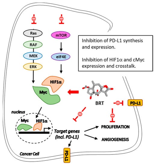 BRT also negatively regulates downstream targets, such as the immune checkpoint protein PD-L1 (programmed cell death-ligand 1) that is frequently overexpressed in tumor cells. PD-L1 is largely implicated in the escape of tumor cells to T-cell killing, and contributes to promote tumor cell survival, migration and proliferation. BRT has been found to markedly inhibit the expression and protein synthesis of PD-L1 in various types of cancer cells, via HIF-1α/c-Myc [67]. Both PD-L1 and HIF-1α play major roles in tumor immune evasion. Notably, HIF-1α induces expression of a variety of immunosuppressive molecules and contributes to the regulation of PD-L1 expression on cancer cells [115]. The co-overexpression of PD-L1 and HIF-1α in tumor tissues, for example in hepatocellular carcinoma tissue, is associated with a high risk of recurrence or metastasis [116]. Thus, interfering with the HIF-1α/PD-L1 axis with BRT can be an efficient way to restore an immuno-sensitivity and to facilitate the action of cytotoxic (CD8+) T cells.