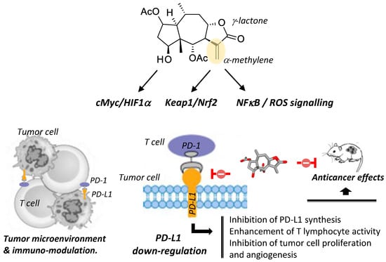 BRT is a sesquiterpene lactones known for more than fifty years, initially considered as an anti-inflammatory and antioxidant agent and later characterized as an anticancer compound. It is a complex, reactive molecule susceptible to forming adducts with free thiol group in proteins, but this non-specific reactivity can be (and probably should be) controlled upon removal or modification of the exomethylene unit of BRT. The compound reduces cancer cells proliferation, survival and migration through multiple signaling pathways, notably via modulation of the NFκB, Keap1/Nrf2 and HIF1α pathways. In addition, an immunomodulatory function of BRT has been discovered recently. BRT functions as a PD-L1 inhibitor, acting directly and/or indirectly on PD-L1, to reduce its expression, and thereby inhibiting cancer cell proliferation and angiogenesis (Figure 9) [67]. This discovery calls for the analysis of other similar SLs as potential PD-L1 regulators. The time has come to reconsider the use of sesquiterpene lactones for the treatment of cancer, taking into account their under-studied immunomodulatory functions, in addition to their well-established antioxidant, anti-inflammatory and anti-proliferative effects. The capacity of BRT to regulate T cell activity calls for a deeper investigation into the capacity of (exomethylene-modified) SLs to remodel the tumor microenvironment and promote an effective anticancer immune response.
