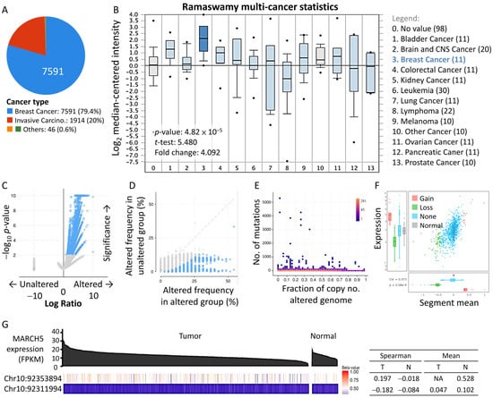 Functional enrichment analysis of MARCH5 in BRCA demographics and clinical events. (A) Circle graphs show percentage of cancer type in the study. (B) Oncomine database analysis of the expression of MARCH5 in different types of cancer. (C,D) Volcano and scatter plots exhibiting genes associated with mutations altered frequency in MARCH5. (E) Proportion graph indicates the ratio of mutation counts and the range of changes in the number of genome alters. (F) A combination of scatter plots and box plots to show a more detailed view of the distribution and correlation of CNVs in breast cancer types. (G) Relationship between MARCH5 and two different datasets from LinkedOmics (http://linkedomics.org/login.php, accessed on 24 August 2021). Red lines represent a positive correlation, and blue lines represent a negative correlation.