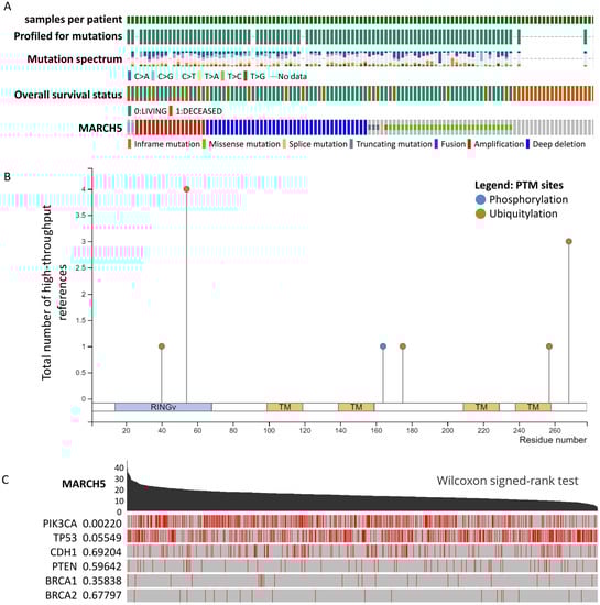 The cBioPortal includes a web resource of genomic data from 9555 breast cancer pathology reports from the TCGA. It provides visualization, analysis, and download of large-scale cancer genomics data from genomic profiles. MARCH5 mutations, copy number variants (CNV), and gene co-occurrence in breast cancer are analyzed by the cBioPortal tool (https://www.cbioportal.org/, accessed on 24 August 2021) [15].