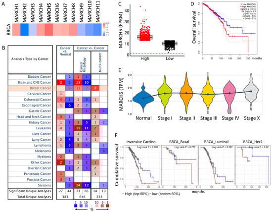 MARCH5 expression levels in different human cancers and survival curves comparing the high and low expression in TCGA database. (A) GEPIA2 software analyzed the expression of MARCH family genes and the overall survival of breast cancer in TCGA. (B) The expression of MARCH5 in different cancer tissues compared with normal tissues. The number in each cell is the number of datasets. The datasets were obtained with the following parameters: p-value threshold of 0.01. (C) Box plot showing the expression levels of the epigenetic regulatory genes in BRCA. (D) Overall survival analyzed using the Kaplan–Meier method with log-rank testing according to MARCH5 expression. (E) Violin plot showing the expression levels of the MARCH5 in different stages of BRCA. (F) Analysis of survival rates of different types of breast cancer based on TCGA database.
