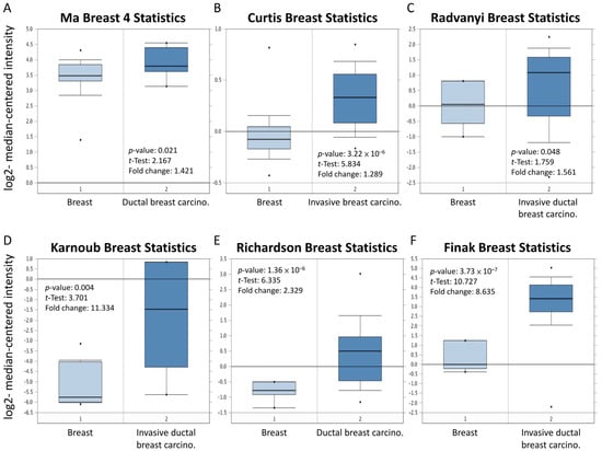 Box and whiskers plots of Oncomine data on MARCH5. MARCH5 mRNA levels from (A) Ma Breast 4 statistics cohort, (B) Curtis Breast Statistics cohort, (C) Radvanyi Breast Statistics cohort, (D) Karnoub Breast Statistics cohort, (E) Richardson Breast Statistics cohort, and (F) Finak Breast Statistics cohort in BRCA and normal tissue. Note: p < 0.05 indicates statistical significance; MARCH5 was among the top 1% overexpressed genes in all six different datasets of BRCA.