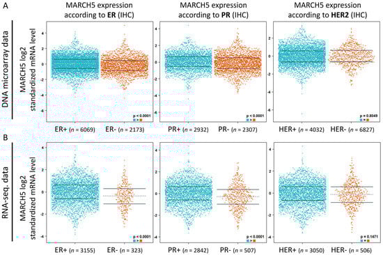 MARCH5 transcription in BRCA (bc-GenExMiner). (A,B) MARCH5 mRNA expression levels were shown in breast cancer patients by bee swarm in DNA microarray datasets and RNA-sequencing datasets. (ER: estrogen receptor; PR: progesterone receptor; HER2: human epidermal growth factor receptor 2).