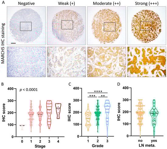 Protein levels of MARCH5 in breast carcinoma. (A) Representative images of MARCH5 staining in BRCA tissues. (B) IHC scores of MARCH5 expression in BRCA tissues. (B–D) Violin plots of MARCH5 expression levels BRCA with significant alterations in different stages, grade, and lymph node metastasis. ** p < 0.01, *** p < 0.001, and **** p < 0.0001. Scale bar = 200 μm.