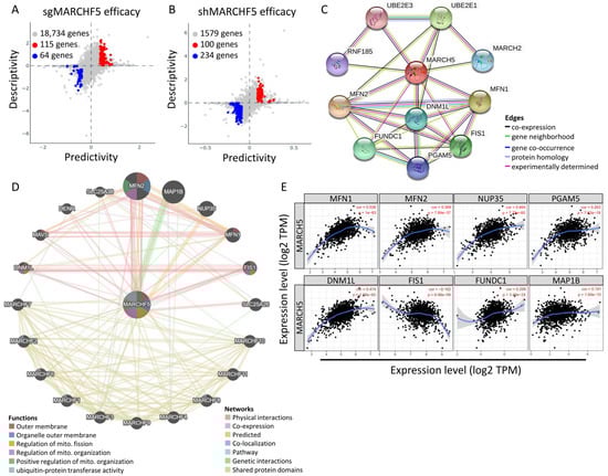 Intergenic correlations, co-expression network, and the biological functions of MARCH5. (A,B) Bidirectional predictive and descriptive analysis of gene expression in breast cancer cell lines. Predictability and descriptiveness between mRNA expression and sgRNA/shRNA efficacy are plotted. Hit genes showing positive or negative scores with p-values <0.01 for both predictive and descriptive aspects were selected. (C) PPI network constructed using the STRING database shows MARCH5 and the interacting proteins. The line thickness indicates strength of interaction between any two proteins. (D) GeneMANIA database analysis shows that MARCH5 interacts with mitochondrial dynamics proteins. (E) The association between MARCH5 and mitochondrial dynamics-related genes.