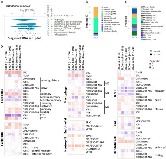 The correlation between MARCH5 and immunization. (A) RNA expression in single-cell clusters of breast cancer by immune marker genes in individual cells by bar graphs. (B,C) Immune cell percentage and fractionation bars showing the expression of the MARCH5 gene and well-known cell type markers in different clusters of single-cell types in tissues. (D) Heatmap showing the correlation between MARCH5 expression and immune infiltration in different breast cancer types. Different algorithms explored the potential correlations in MARCH5 expression level and T cell CD4+, T cell CD8+, macrophage, endothelial, neutrophil, B cell, dendritic cell, and cancer-associated fibroblasts (CAF) across types of BRCA in TCGA.