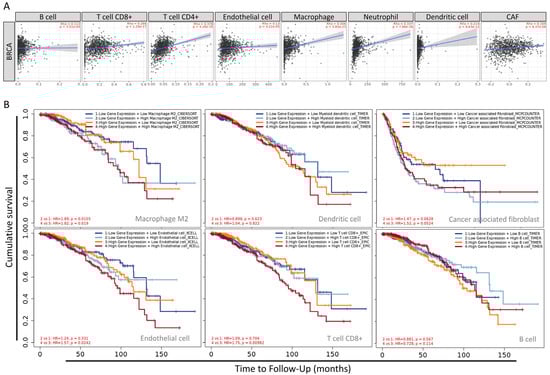 The statistical scatter plot of the database showed that MARCH5 expression was associated with B cells (Rho = 0.113, p = 3.51 × 10−4), T cell CD8+ (Rho = 0.266, p = 1.29 × 10−17), T cell CD4+ (Rho = 0.378, p = 4.26 × 10−35), endothelial cells (Rho = 0.13, p = 4.22 × 10−5), macrophage (Rho = 0.306, p = 5.85 × 10−23), neutrophil (Rho = 0.337, p = 7.96 × 10−28), dendritic cell (Rho = 0.214, p = 8.63 × 10−12) CAF (Rho = 0.169, p = 8.37 × 10−8) (Figure 9A). MARCH5 mediates the migration and localization of immune cells. Increasingly, information suggests that immune cell infiltration can accelerate tumor progression and recurrence, affecting immunotherapy and clinical outcomes. The correlation between MARCH5 expression in BRCA, the abundance of immune infiltrates (macrophages, dendritic cells, CAF, endothelial cells, T cells, and B cells), and survival time is shown in Figure 9A. Patients with high MARCH5 gene expression and high macrophage infiltration all had shorter survival times than those with high gene expression (Figure 9B).
