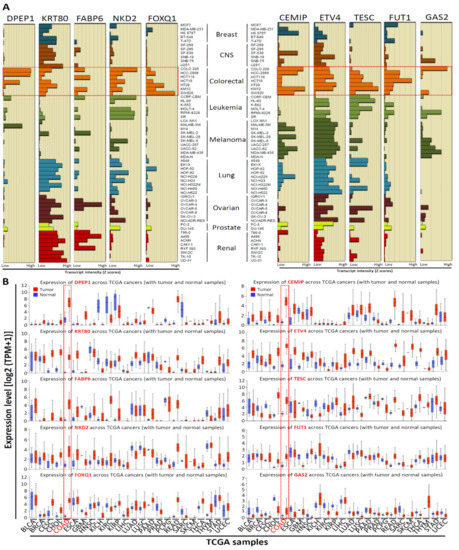 Top 10 upregulated CRC-associated genes mRNA expression in the National Cancer Institute (NCI)-60 human tumor cell lines and TCGA pan-cancer tissues. (A) Relative top 10 upregulated CRC-associated genes expression profile in National Cancer Institute (NCI)-60 cancer cell lines from the CellMiner NCI-60 analysis tool. Bars to the left show relative low expression, while bars to right show high expression. (B) The top 10 upregulated CRC-associated genes expression in various clinical cancer tissues were compared with those in corresponding normal tissues (UALCAN database), the red dot rectangle indicated colon adenocarcinoma (COAD).