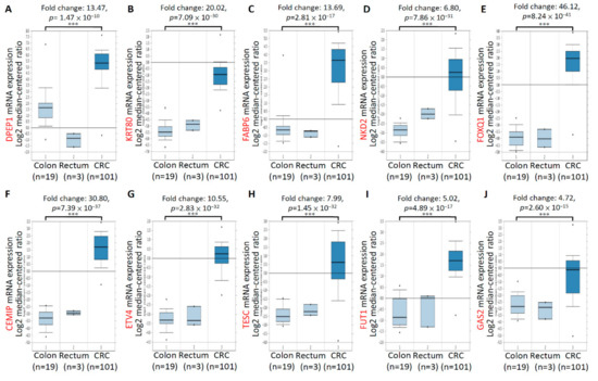 Gene expression changes were analyzed using the TCGA microarray dataset of the Oncomine website (www.oncomine.org, accessed on 30 March 2021) by using colorectal tumors and normal colorectal tissues. In this study, the mRNA expression levels of the top 10 upregulated CRC-associated genes were compared in CRC and normal control samples using the Oncomine database.