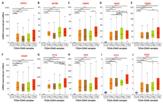 The relationship between mRNA expressions of the top 10 upregulated CRC-associated genes and the individual cancer stages. Individual cancer stages from 274 TCGA-colon adenocarcinoma (COAD) samples include stage 1 to stage 4. The figure presented in (A–J) to show the mRNA expressions of 10 upregulated CRC-associated genes changed across all the tumor stages of COAD samples. * p < 0.05, ** p < 0.01, *** p < 0.001.