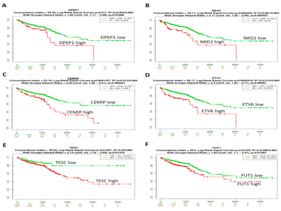 The prognostic relevance of the 10 genes in CRC patients from the TCGA-CRC dataset (n = 466) was analyzed using a SurvExpress survival analysis [25]. The results demonstrated that the high expression levels of DPEP1 (Figure 4A), NKD2 (Figure 4B), CEMIP (Figure 4C), ETV4 (Figure 4D), TESC (Figure 4E), and FUT1 (Figure 4F) were associated with poor outcomes in CRC patients. However, the expression levels of KRT80, FABP6, FOXQ1, and GAS2 mRNAs (Supplementary Figure S2A–F) were not significantly associated with the clinical outcomes of CRC patients. Collectively, these results indicate that a high expression of DPEP1, NKD2, CEMIP, ETV4, TESC, or FUT1 may indicate a worse prognosis for CRC patients.