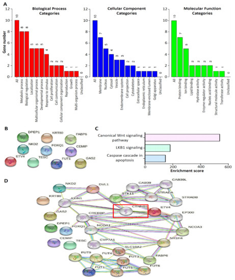 Gene function and pathway enrichment analysis of the top 10 upregulated CRC-associated genes. (A) Gene ontology analysis of the top 10 upregulated CRC-associated genes. The results are presented for the following three categories: Biological process, cellular component, and molecular function. The bar represents the number of genes in the user list. Protein–protein interaction network analysis of the top 10 upregulated CRC-associated genes (B), which was involved in the canonical Wnt signaling pathway to perform using the Enrichr method (C). (D) CTNNB1 was predicted as the key factor involved in the canonical Wnt signaling pathway for interaction with the 10 upregulated CRC-associated genes.