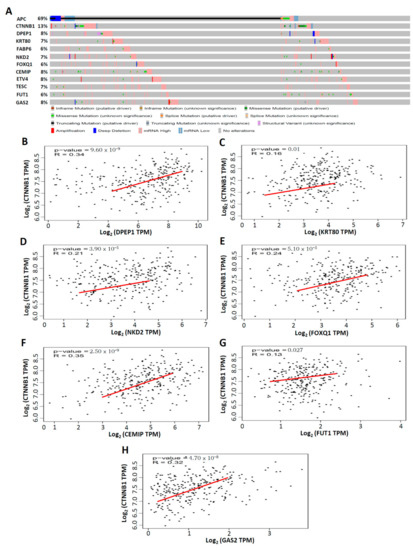 3.5. Top 10 Upregulated CRC-Associated Genes in Genetic Alterations and Their Correlation with CTNNB1 in CRC