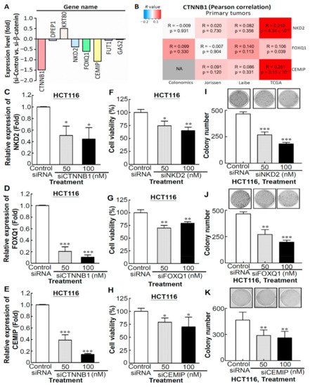 To further investigate the correlation between CTNNB1 and the aforementioned seven genes, we first investigated the expression of CTNNB1 and the aforementioned seven genes in SW480 cells with CTNNB1 knockdown compared with the siRNA control-transfected SW480 cells, which were obtained from the public GEO dataset (GSE20966). We observed that the CTNNB1 transcript was downregulated by approximately 1.5 times in siCTNNB1-transfected SW480 cells and the expression trend of NKD2, FOXQ1, and CEMIP transcripts was also downregulated (Figure 7A). Next, we performed the web-based interface-CANCERTOOL [21] for the correlation analyses of CTNNB1 and corresponding target genes of CTNNB1 in multiple CRC clinical datasets. As shown in Figure 7B, a positive correlation between the expression of CTNNB1 and NKD2, FOXQ1, or CEMIP was observed in the four available CRC datasets. To address the abovementioned, the expression of the CTNNB1, NKD2, and FOXQ1 transcripts was detected in siCTNNB1-transfected HCT116 cells. As shown in Figure 7C–E, the expression of NKD2, FOXQ1, and CEMIP transcripts were significantly downregulated in the CTNNB1-knockdown of HCT116 cell line. In addition, in order to understand the functions of NKD2, FOXQ1, and CEMIP genes in CRC cells, the viability of CRC cells was manipulated through NKD2, FOXQ1, and CEMIP expression, respectively. Compared to the control siRNA-transfected HCT116 cells, knockdown of the endogenous expression of NKD2, FOXQ1, or CEMIP in HCT116 cells caused significant decreases in cell proliferation (Figure 7F for siNKD2, Figure 7G for siFOXQ1, Figure 7H for siCEMIP) and colony numbers and sizes, as compared to the control siRNA (Figure 7I for siNKD2, Figure 7J for siFOXQ1, Figure 7K for siCEMIP). Collectively, our results suggest that CTNNB1 plays a critical role in regulating the expression of NKD2, FOXQ1, and CEMIP in CRC cells.
