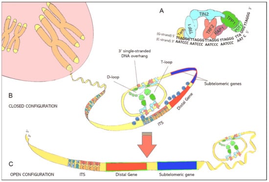 (A): Illustration of the shelterin nucleoprotein complex, which protects coding DNA and discriminates telomeres from other free DNA ends resulting from DNA damage. (B): Illustration of the closed chromatin configuration at telomeric ends. Due to protein-protein interactions and the specific binding of shelterins to telomeric DNA, double-stranded telomeric DNA is forced to fold back in a loop structure (T-loop) while the 3′ single-stranded DNA overhang is hidden inside the D-loop. The binding of shelterins to interstitial telomeric sequences (ITS) leads to the formation of interstitial telomeric loops (ITL) and establishes a closed chromatin structure that impedes the expression of subtelomeric and distal genes through telomere position effects (TPE). (C): lllustration of the open chromatin configuration at telomeric ends. Critically short telomeres can no longer maintain the compact chromatin structure. The resulting open chromatin structure facilitates the access of the translational machinery to genes that were formerly silenced by TPEs.