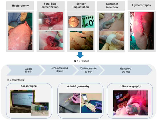 Fetal hindlimbs were exteriorized through hysterotomy, and fentanyl (0.2 mL, IM) was administered for fetal anesthesia. An incision of 3–4 cm in the right inguinal zone was performed for the fetal iliac artery dissection. Catheterization of the iliac artery was performed for all the included fetuses (n = 8) with a thin catheter (0.75 mm of internal diameter and 1.45 mm of external diameter) and was used for serial fetal blood sampling in order to evaluate acid-based metabolites (using the EPOC reader and EPOC BEGM test card, Alere/Siemens Healthcare, Barcelona, Spain). The catheter was fixed with simple knots (silk, 3/0) and fetal skin was closed with a running suture (polyglycolic acid, 3/0). Thereafter, 1–2 oxygen and 1–2 pH electrochemical sensors were inserted in the right and left femoral fetal quadriceps, respectively. We did a 1-cm skin incision and the femoral quadriceps was exposed. Electrochemical sensors were implanted through a 2–3 mm muscle incision and secured to the parenchyma using simple knots (silk, 3/0). One to two oxygen or pH electrochemical sensors were inserted in each animal. The skin was closed using a running suture (polyglycolic acid, 3/0). Afterwards, the umbilical cord was also exteriorized through hysterotomy and a vascular occluder (OC20HD, UNO Roestvaststaal BV, Zevenaar, Netherlands) connected to a 10 mL syringe loaded with saline was placed around the umbilical cord. Finally, fetal hind limbs and umbilical cord were interiorized inside the uterus. An amniotic catheter was also inserted through the hysterotomy in order to infuse warm NaCl 0.9% to maintain the temperature and amniotic volume throughout the experiment. The amniotic cavity insufflation was performed until the initial DVP was reached (approximately 150 mL). Sensor wires, iliac vascular catheter, amniotic catheter, and the occluder tubing were exteriorized through the uterine incision. Hysterorraphy was then performed using a running suture (polidioxanone, 3/0). The electrodes of the electrochemical sensors were connected to a portable electrochemical device for the continuous monitoring of the signals of the oxygen and pH electrochemical sensors. During the experiment, the uterus was kept outside the abdominal cavity and was continuously rinsed with warm NaCl 0.9% and temperature controlled with an external thermal lamp.