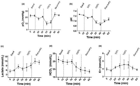 Evolution of arterial acid-based metabolites during the occlusion protocol (basal, 50% occlusion, 100% occlusion and recovery periods): (a) Partial pressure of oxygen (pO2); (b) pH; (c) lactate; (d) bicarbonate (HCO3−); and (e) potassium (K+) concentration. Data are expressed as mean ± SEM. Statistical significance was declared when * p < 0.05, ** p < 0.01, *** p < 0.001 between basal and each time point; n = seven animals, except for recovery period, n = four animals.