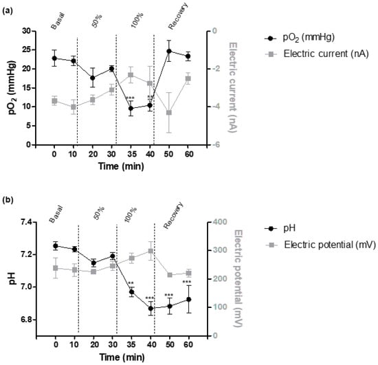 (a) Evolution of partial pressure of oxygen (pO2) (measured by arterial gasometry) and electric current (nA) (measured by oxygen electrochemical sensors); (b) evolution of pH (measured by arterial gasometry) and electric potential (mV) (measured by pH electrochemical sensors) during the occlusion protocol. Data are expressed as mean ± SEM. For pO2 sensing, nine electrochemical sensors; for pH sensing, 10 electrochemical sensors. Statistical significance was declared when ** p < 0.01 and *** p <0.001 between basal and each time point.