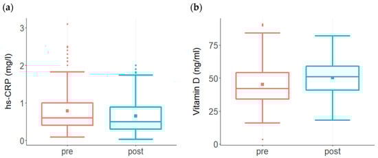 The ReCODE program was developed to offset the range of several biochemical risk factors linked to AD, making it possible to test whether these parameters can be altered. In addition to being a risk factor of cardiovascular disease, elevated levels of high-sensitivity C-reactive protein (hs-CRP) are suggested to serve as a biomarker for cognitive impairment risk associated with systemic inflammation [,,,]. As shown in Figure 1, a significant decline in hs-CRP was observed in the treatment group compared to the high levels at baseline (Figure 1a).