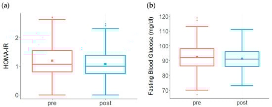 Changes in HOMA-IR and Fasting Glucose levels among participants enrolled in the ReCODE program. (a) A significant decline in HOMA-IR (p < 0.002) was observed in the treatment group (n = 176) compared to the high levels at baseline. While baseline HOMA-IR ranged from 0 to 2.7 with a mean of 1.2, post-treatment levels ranged from 0 to 2.5 with a mean of 1.07. The baseline median score was 1.1, post-treatment median score was 1.0. (b) A significant reduction in fasting glucose (p < 0.01) is observed among participants (n = 208) following the treatment protocol. While baseline fasting glucose levels ranged from 67 to 119 with a mean of 93, post-treatment scores ranged from 73 to 111 with a mean of 91. The baseline median score was 92, post-treatment median score was 91.