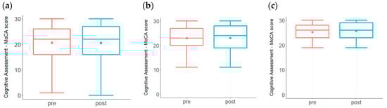 MoCA test scores from participants prior to and after the inception of the program. While there is a trend toward increased scores (a) among the entire participant pool (n = 251), statistical significance was not achieved (p = 0.484). (b). MoCA test scores were evaluated among participants with baseline score ≥ 10 (n = 212). Improvement in the post-treatment scores was statistically significant (p < 0.05). (c). MoCA test scores of participants (n = 151) with a baseline score of ≥ 19 showed statistically significant improvement in the post-treatment scores (p < 0.005).