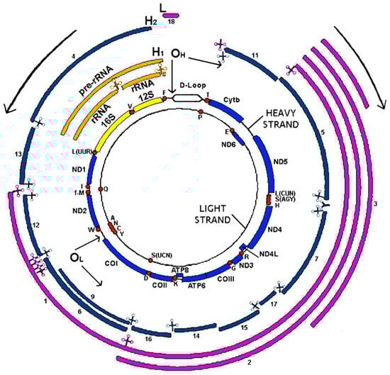 - Giles, R.E.; Blanc, H.; Cann, H.M.; Wallace, D.C. Maternal inheritance of human mitochondrial DNA. Proc. Natl. Acad. Sci. USA 1980, 77, 6715–6719. [Google Scholar] [CrossRef]