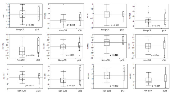 Tissue microRNA (miRNA) levels in 51 patients. To identify clear differences in tissue miRNA levels between the pCR and non-pCR groups, we enrolled 11 patients with a pCR and 40 without a pCR. The dot plots represent 12 miRNA levels quantified by TaqMan real-time polymerase chain reaction (PCR) and normalized to internal controls: U6 level using the 2−ΔΔCt method and stratified by pathological response to neoadjuvant chemoradiotherapy. The horizontal bars represent the medians and 95% confidence intervals. pCR: pathological complete response.