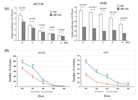 miRNA-148a modulated the proliferation and radiosensitivity of HCT116 and HT29 cells after irradiation. Both cell lines were transfected with a pCDH-miR148a plasmid (miRNA-148a) or a negative scrambled pCDH vector (EM). miR-148a overexpression enhanced the inhibitory effect of cell proliferation (A) and colony formation (B) after 2-, 4-, 6-, and 8-Gy irradiation (N = 3; * p < 0.05; ** p < 0.001).