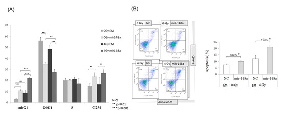 To determine the effects of miRNA-148a on cell cycle alterations, flow cytometry was conducted. A significantly increased G2/M arrest was observed in cells transfected with the miRNA148a mimic after 24 h; furthermore, the increase in the proportion of cells in the G2/M phase was more prominent in cells overexpressing miRNA148a and subjected to 4-Gy radiation (p < 0.01; Figure 4A). Similarly, miRNA148a overexpression significantly increased the proportion of cells in the sub-G1 phase, regardless of whether radiation was performed (p < 0.001). By contrast, miRNA148a overexpression corresponded to a substantial reduction in the proportion of cells in the G1 phase, whereas miRNA148a overexpression exerted no influence on S-phase alterations.