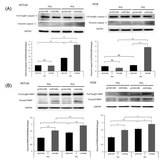 miRNA-148a promoted apoptosis in irradiated HCT116 and HT29 cells. Following irradiation with 0 or 4 Gy, the cells were harvested, and the total protein was extracted for Western blotting. (A) miR-148a enhanced the irradiation-induced upregulation of cleaved caspase-3 (N = 3; * p < 0.05; ** p < 0.01). (B) miR-148a enhanced the irradiation-induced upregulation of cleaved poly (ADP-ribose) polymerase (N = 3; * p < 0.05; ** p < 0.01).