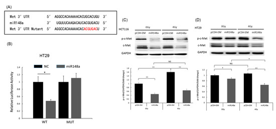 c-Met is a target gene of miRNA-148a and is mediated in CRC cells. (A) The complementary sequences of miRNA148a and c-Met, as well as the mutant sequences of the c-Met binding site. (B) Wild-type c-Met binds to miRNA-148a, whereas the MUT does not. (C) In HCT116 cells, c-Met expression changed with miRNA-148a expression and irradiation. (D) In HT29 cells, c-Met expression changed with miRNA-148a expression and irradiation. (N = 3; * p < 0.05; ** p < 0.01). NC: negative control; MUT: mutant.