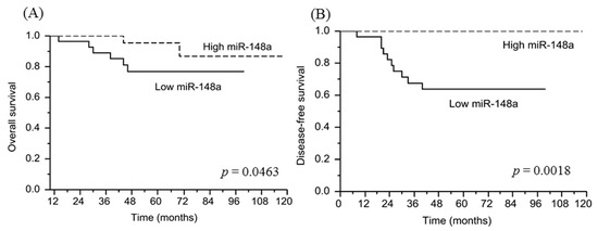 Survival curves of the 51 patients. (A) Overall survival in patients with low miRNA-148a expression was significantly poorer than that in those with miRNA-148a overexpression (p = 0.0463). (B) Disease-free survival in patients with low miRNA-148a expression was significantly shorter than that in patients with miRNA-148a overexpression (p = 0.0018).