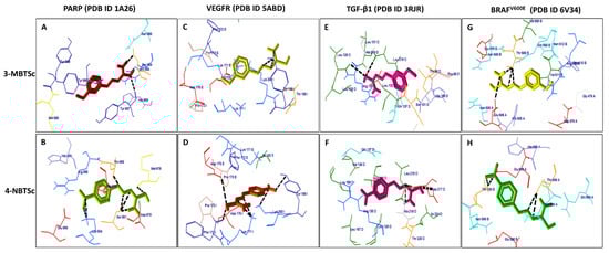 Molecular docking calculations were carried out using Patch dock server-Bioinfo 3D [47]. Four targeted proteins, BRAF, TGF-β1, PARP, and VEGFR-1 were selected based on their role in different cellular signaling pathways for the development and progression of breast and skin cancers. BRAFV600E is a common mutation in BRAF protein of melanoma cells [8]. Pro-Transforming Growth Factor-beta 1 (TGF-β1) plays a pleiotropic role in melanoma progression [14,15] and it is also an important regulator of normal mammary gland development as well as it leads to the progression of breast cancers [48]. While poly (ADP-ribose) polymerase (PARP) is a nuclear enzyme that facilitates DNA repair and play an imperative role in germline mutations [20]. Further, Vascular Endothelial Growth Factor Receptor-1 (VEGFR-1) plays a significant role in tumor-associated angiogenesis, tissue infiltration, and metastasis development [49]. All structures of BRAFV600E (PDB ID: 6V34), TGF-β1 (PDB ID: 3RJR), PARP (PDB ID: 1A26), and VEGFR-1 (PDB ID: 5ABD) were downloaded as PDB file from Protein Data Bank database (https://www.rcsb.org/. Last accessed 12 February 2021). All protein structures were cleaned of inhibitors and water molecules to avoid their interference during docking. Chem Sketch was used to draw and clean the structures of the synthesized compounds (3-MBTSc and 4-NBTSc). Then, the mol file was generated and converted to PDB format. After that, both compounds were docked to the active sites of the enzymes. Patch dock generated 20 best compound-enzyme interactions in various positions; then, using Fire dock, 10 more refined results were selected based on global energy (binding energy of the solution), attractive and repulsive van der Waals energy, atomic contact energy, geometric shape complementarity score, and approximate interface area.