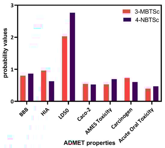 The ADMET properties of the test compounds are predicted using admetSAR (http://lmmd.ecust.edu.cn/admetsar1. Last accessed on 20 July 2021) [54] and presented in Figure 2 and Table S3. Blood-brain barrier (BBB) penetration, human intestinal absorption (HIA), Caco-2 cell permeability, and AMES toxicity along with LD50 and additional ADMET properties were calculated. A blood-brain barrier and human intestinal absorption value closer to 1 represents better permeability and absorption through BBB and intestine [65]. Both 3-MBTSc and 4-NBTSc have high intestinal absorption and BBB permeability. When predicting the efflux by P-glycoprotein (P-gp), they prove to be both non-substrate and non-inhibitor. Also, both the test compounds exhibit non-substrate and non-inhibitor behavior on most of the CYP450 isoforms. AMES toxicity and carcinogenicity test helps to identify a potential mutagenic and cancer-causing molecule. Lethal Dose 50 (LD50) is the quantity of a drug that can kill 50% of the test organisms’ population [65]. Both the test compounds are non-carcinogenic and have a good LD50.
