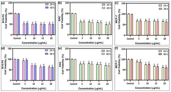 Both 3-MBTSc and 4-NBTSc compounds were evaluated for their anticancer potential against MCF-7, B16-F0, and EAC cells in dose-dependent manner till 48 h. The IC50 values for 3-MBTSc compound on MCF-7, B16-F0, and EAC cells were calculated to be 2.821 ± 0.008 µg/mL, 2.904 ± 0.013 µg/mL, and 3.355 ± 0.012 µg/mL, respectively (Table 3). From the obtained results, the anticancer potential of 3-MBTSc compound was more potent against MCF-7 cells followed by B16-F0 and EAC cells (Figure 4a–c). Further, The IC50 values for 4-NBTSc compound on MCF-7, B16-F0, and EAC cells were calculated to be 7.102 ± 0.010 µg/mL, 7.129 ± 0.012 µg/mL, and 3.832 ± 0.014 µg/mL, respectively. From the obtained results, the anticancer potential of 4-NBTSc compound was more potent against EAC cells followed by MCF-7 and B16-F0 cells (Figure 4d–f, Table 3). Moreover, the 3-MBTSc compounds showed higher anticancer therapeutic effects compared to 4-NBTSc compound (Table 3). To validate the anticancer potential of both compounds, the DOX was used as a positive control. The calculated IC50 value of DOX on MCF-7 cells was 3.162 ± 0.018 µg/mL, respectively (Figure S4).