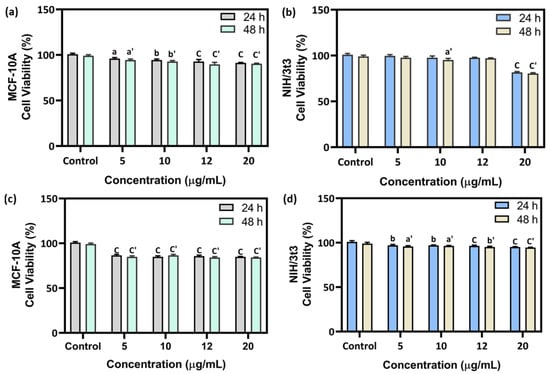 Cytotoxicity of (a,b) 3-MBTSc and (c,d) 4-NBTSc compounds on MCF-10A and NIH-3T3 cells. The toxicity was measured by MTT in a dose-dependent manner till 48 h. All the experiments were conducted three independent times and each treatment was kept in triplicates (n = 3). a, a’ = * p < 0.05; b, b’ = ** p < 0.01; c, c’ = *** p < 0.001.