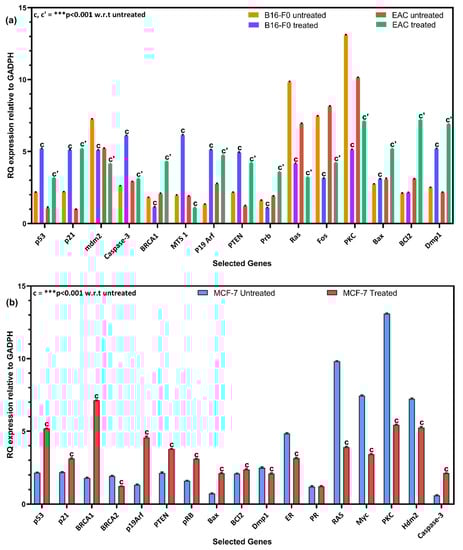 The RT-qPCR was performed on RNA isolated from B16-F0 melanoma, EAC and MCF-7 human breast cancer cells treated with 3-MBTSc and 4-NBTSc. Interestingly, the gene expressions of treated cells are significantly different from untreated and control cells (p < 0.001) (Figure 6 and Figure 7 and Tables S4–S9). Tumor suppressor genes are upregulated, and oncogenes are downregulated significantly. The activity of both ligands varied with respect to cell line type. In general, 3-MBTSc treated cells showed a significant upregulation of BRCA1, Dmp1, and MTS1 in MCF-7, EAC, and B16-F0 cells, where they are upregulated in 5.33, 4.75, and 4.25 folds, respectively (Figure 6 and Tables S4–S6). The effect of the 3-MBTSc varied with respect to cell line and type of genes. In line with this, BRCA1, p19Arf, and p53 genes in MCF-7 breast cancer cells; MTS1, p19Arf, and p53 genes in B16-F0 melanoma, and Dmp1, p21, and BCl2 genes in EAC cell lines are among significantly upregulated tumor suppressor genes. On the contrary, with respect to untreated cells, the activities of oncogenes in 3-MBTSc treated cells are significantly (p < 0.001) downregulated. Along with this line, the expression of oncogenes like PKC, RAS, and Fos with −7.96, −5.66, and −4.31 folds in B16-F0 cells; PKC, RAS, and Myc with −7.64, −5.92, and −4.02 folds in MCF-7 tumor cells are significantly downregulated (Tables S4–S6). Conversely, the expression of Caspase-3, an apoptosis-inducing gene, is upregulated by 3.50 and 1.53 folds in B16-F0 melanoma and MCF-7 tumor cells, respectively.