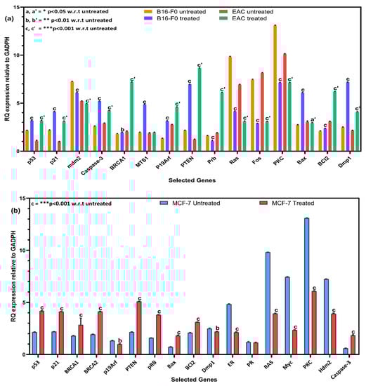 Similarly, 4-NBTSc treated cells, most tumor suppressor genes showed a significant upregulation. Notably, PTEN, BRCA1, and pRB are highly activated with 7.42, 5.13, and 4.19 folds in EAC, respectively (Figure 7 and Tables S7–S9). Likewise, PTEN, Dmp1, and Bax are upregulated with 4.82, 4.7 and 3.35 folds in B16-F0 melanoma. Also, in MCF-7 breast cancer cell lines, PTEN, pRB, and BRCA2 are upregulated with 2.95, 2.21, and 2.195 folds, respectively. In comparison, the expressions of oncogenes are significantly downregulated in 4-NBTSc treated cells. In MCF-7 tumor cells, PKC, RAS, and Myc are downregulated by −7.0, −5.88 and −5.1 folds, respectively. Likewise, PKC, RAS, and Fos genes are downregulated with 5.95, 5.68, and 4.54 in B16-F0 cells. Similarly, Fos, RAS, and PKC are downregulated with 5.0, 3.81, and 3.0 folds in EAC cells, respectively (Tables S7–S9).