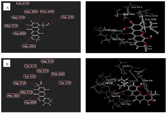 The docking results indicated that the total energy and MDS of compound 2 were 108.388 kcal/mol and −78.81 kcal/mol, and 144.003 kcal/mol and −74.54 kcal/mol for Compound 5 (Table 6). The binding mode of these compounds, as shown in Table 6 and Figure 2, revealed that compounds 2 and 5 inhibit the acid-alpha-glucosidase through hydrogen bonding and steric interaction. These compounds are bound to the active site of human lysosomal acid-alpha-glucosidase enzyme (5NN8) through hydrogen-bonding interaction of carbonyl, chelate hydroxyl, and free hydroxyl groups with Arg600, Asp518, and Asp404 residues. The steric interaction of compound 2 was formed by the oxygen atom of a carbonyl group with Met519 residue, xanthone backbone and the pyran ring with Asp282(2) and Phe649 residues, and the dimethylallyl group with Trp376 residue. The similar interaction was also formed by compound 5 with Asp282 (2), Asp518, Asp616, Trp613 (2), Trp516, Trp376, Phe649, Met519, and His674 residues.