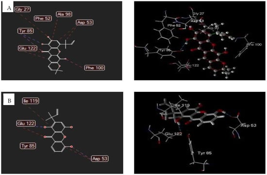 The interaction analysis indicated that compound 2 bound to 1CET via hydrogen bonding of oxygen atom of hydroxyl chelate group (C1) with Tyr85 residue and oxygen atom of carbonyl with Phe52 residue. The steric interaction was established by xanthone backbone and the dimethylallyl group of compound 2 with Tyr85, Glu122(2), Asp53(2), Gly27, Ala98, and Phe100 residues. The hydrogen bonding was also formed by carbonyl group, chelate hydroxyl, and free hydroxyl (C5) of compound 3 with Tyr85(2) and Phe52 residues. The Glu122, Tyr85, Asp53(2), and Ile119 residues of 1CET bound to carbonyl groups, free hydroxyl (C5), and dimethylallyl group of compound 3 by steric interactions (Figure 3).