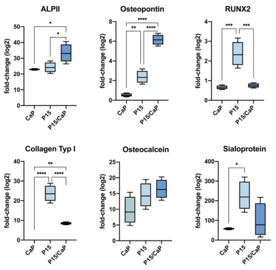 We first investigated the effect of each cement component on the osteodifferentiation of MESs. Cells were treated with either CPC, P-15, or a mixture of both. Untreated cells served as controls. Cells were cultured for 10 days. Characterization of osteodifferentiation was performed by RT-PCR, measuring the mRNA expression of ALPI II, osteopontin, RUNX2, collagen type-I, osteonectin, and osteocalcin. After treatment with CPC, the following were upregulated: ALPI II (22.91 ± 0.011-fold, p < 0.0001), osteopontin (0.51 ± 0.1-fold, p < 0.0001), RUNX2 (0.65 ± 0.06-fold, p < 0.0001), osteonectin (2.92 ± 0.1-fold, p < 0.0001), and osteocalcin (8.64 ± 0.41-fold, p < 0.0001). Treatment with P-15 lead to stronger osteodifferentiation, with upregulation of ALPI II (24.01 ± 2.48-fold, p < 0.0001), osteopontin (2.28 ± 0.7-fold, p < 0.0001), RUNX2 (2.36 ± 0.62-fold, p < 0.0001), collagen type-I (23.86 ± 4.11-fold, p < 0.0001), osteonectin (8.83 ± 2.1-fold, p < 0.0001), and osteocalcin (14.47 ± 3.87-fold, p < 0.0001). Treatment with CPC/P-15 lead to similar results, with the upregulation of ALPI II (33.27 ± 5.8-fold, p < 0.0001), osteopontin (6.15 ± 0.52-fold, p < 0.0001), RUNX2 (0.75 ± 0.1-fold, p < 0.0001), collagen type-I (8.5 ± 0.6-fold, p < 0.0001), osteonectin (12.12 ± 1.75-fold, p < 0.0001), and osteocalcin (16.43 ± 3.04-fold, p < 0.0001) (Figure 1).