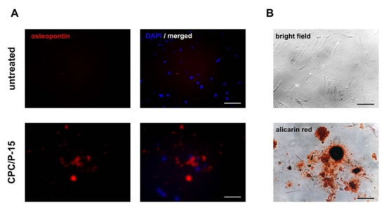 To substantiate osteodifferentiation, immunofluorescence staining of osteopontin and staining of Ca2+ deposits using Alizarin Red were used. MESs were cultured in a growth medium and showed no osteopontin or Alizarin Red labeling. When treated with CPC/P-15, osteopontin and Ca2+ deposits, colored red by the Alizarin Red staining, were detected after 10 days (Figure 2A,B).