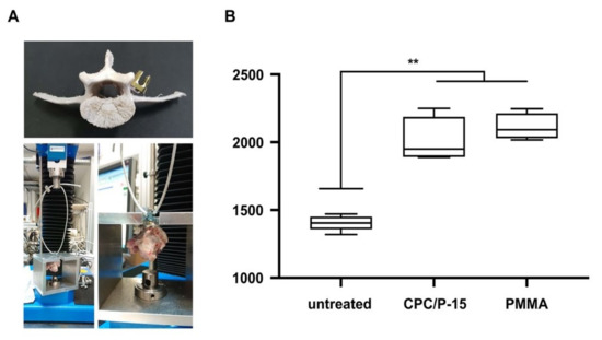Pullout strength was measured 12 h after pedicle screw insertion. Fmax in untreated vertebrae was 828 ± 66 N, in those with PMMA, 1324 ± 712 N (p = 0.04), and 1252 ± 131 N (p < 0.0078) in those augmented with CPC/P-15. There was no statistically significant difference between PMMA and CPC/P-15 (p = 0.94; Figure 5).